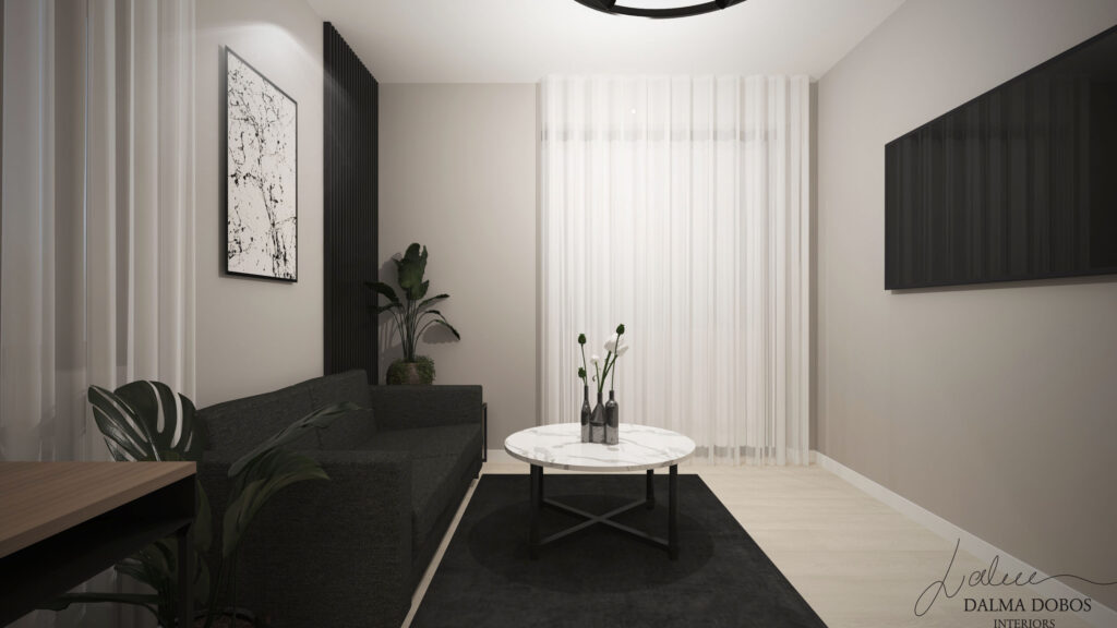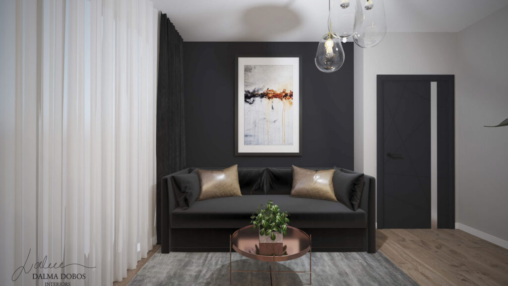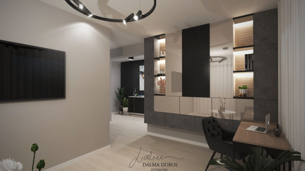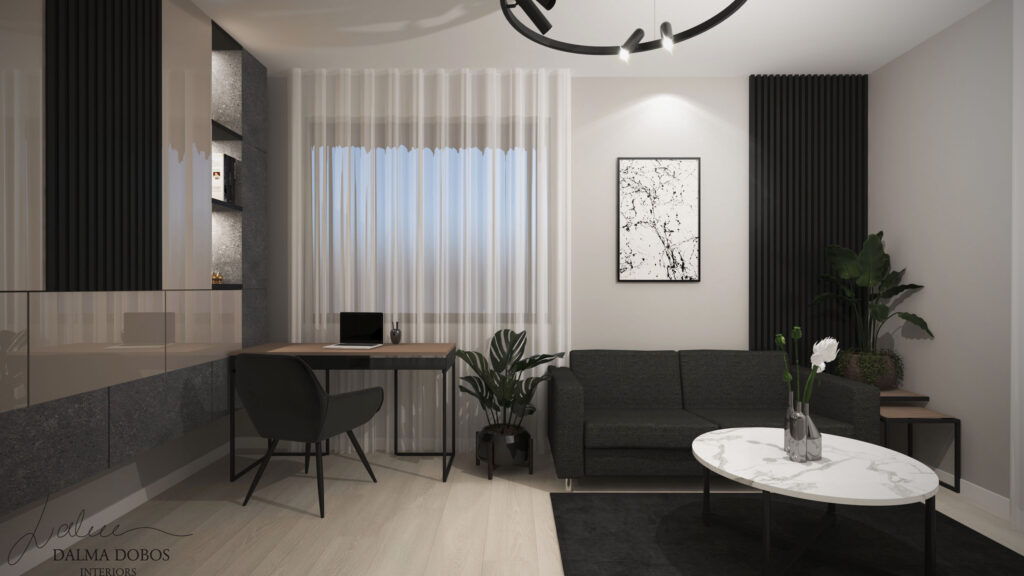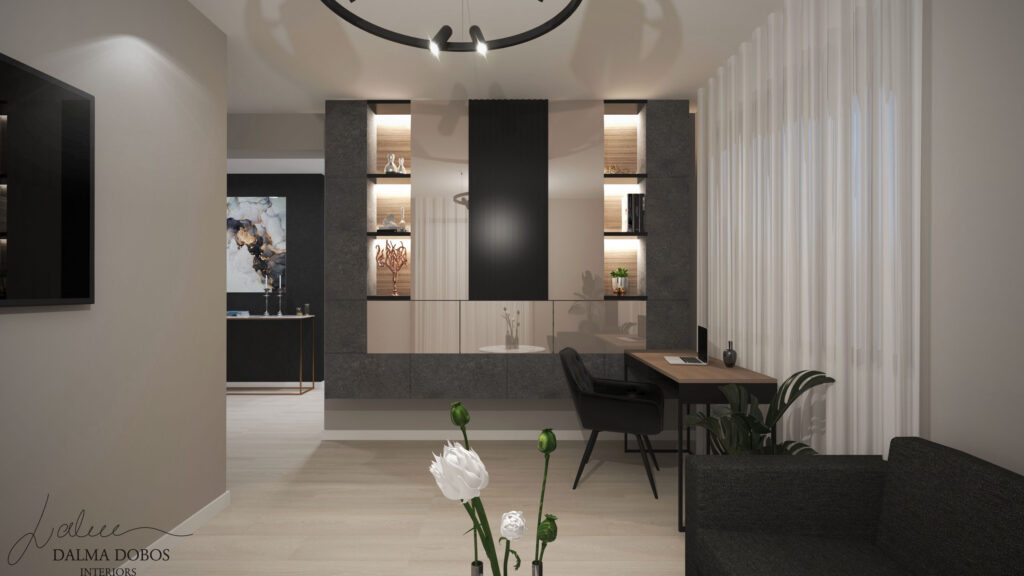 Numeroasele tonuri de negru și antracit, atât mat cât și lucios, aduc o dinamică specială spațiilor locuinței îmbinându-se perfect cu tonurile de alb, griuri deschise, auriu și în special lemn. Corpurile de iluminat alese oferă o atmosferă rafinată fiecărei camere din punct de vedere estetic, dar și practic. Mobilierul este realizat în linii nu foarte complexe pentru a evita senzația de aglomerație, iar accesorizarea discretă redă un plus de dinamică, mai ales datorită plantelor verzi.
