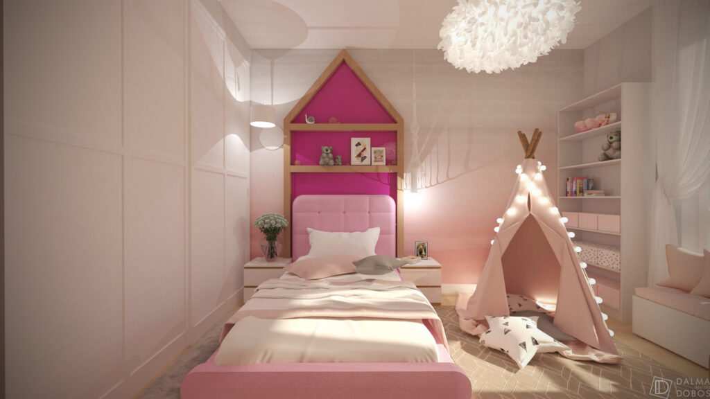 Tonurile puternice de lemn și roz se îmbină perfect cu nuanțele de alb și gri, o compoziție armonioasă pentru o cameră primitoare.